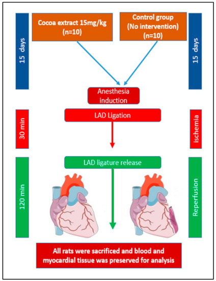 Twenty rats were divided into two groups, control and treated, with ten (10) in each group. The selected dose of 15 mg/kg of cocoa from our previous results was given to the treated group (n = 10) once a day for 15 days. The control group remained untreated. Rats (n = 20) were anesthetized with 5% isoflurane in 50% O2 administered through a facial mask and maintained anesthesia using 2% isoflurane throughout procedure. These anesthetized animals were subjected to ischemia for 30 min by left anterior descending (LAD) coronary artery ligation, followed by 120 min reperfusion, as previously described [21]. The onset of ischemia was confirmed when cyanosis developed on the wall of the ischemic myocardium, as evidenced by saddleback-type (ST) segment elevation and a significant T-wave increase recorded on the electrocardiograph Power Lab data acquisition system (model ML866, AD Instruments, Colorado Springs, CO) and Animal Bio Amp (model ML136, AD Instruments)). Then, the ligation was opened to allow reperfusion to the ischemic part of the myocardium for 120 min. Hearts were excised as demonstrated in Figure 1, the ischemic part of the left ventricle was split into two: one portion was stored in 4% formalin for immunohistochemistry and Terminal Deoxynucleotidyl Transferase dUTP Nick End Labeling (TUNEL) analysis, the second portion was stored in liquid nitrogen for of nitro-oxidative stress measurements. Experimental design is illustrated in Figure 1.