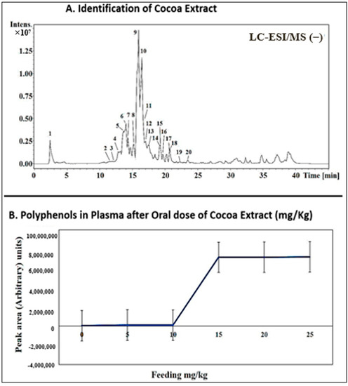 Cocoa Extract: (A) shows HPLC-ESI-MS graph with various peaks correlating with 19 different phenolic compounds found in cocoa extract. (B) shows a curve correlating different oral doses (mg/kg) of cocoa extract and blood levels of phenolic compounds in rats. It shows an optimal dose of 15 mg/kg to be the optimal dose of cocoa extract (six groups (n = 30) and each group (n = 5)).