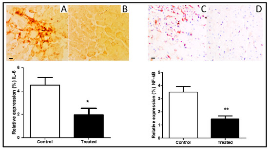 Immunohistochemical analysis showing expression (representative images, 20× magnification) of IL-6 and NF-kB2 in myocardial tissue of cocoa treated rats (n = 10) compared to control rats (n = 10), (*p = 0.0032, **p = 0.0001 respectively). presented as mean ± SD and scale bar is 100 µm. (A,B): IL-6, (C,D): NF-kB.
