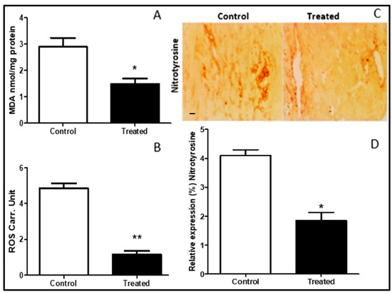 Oxidative stress was studied by identifying the levels of the “lipid peroxidation index, Thiobarbituric acid reactive substances (TBARS)”. TBARS expressed as malondialdehyde (MDA) levels was lower in the treated group as compared to control (Figure 4A). The concentration of ROS was also attenuated in the treated group as compared to control (Figure 4B). Nitrosative stress was assessed by measuring nitrotyrosine levels in myocardial tissue. The nitrotyrosine was reduced by cocoa treatment (p < 0.05) (Figure 4C,D).