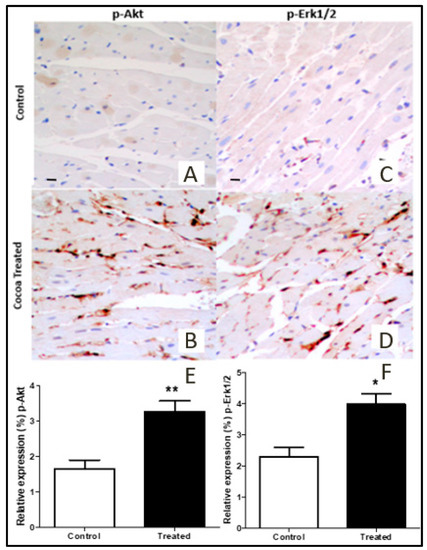 Immuno-peroxidase analysis of p-Akt and p-ERK1/2 in myocardial tissue from rats treated with cocoa extract and control group was performed. Enhanced phosphorylation of Akt (Figure 5A,B,E) and ERK1/2 (Figure 5C,D,F) was observed as compared to control group (p < 0.05 in both cases).