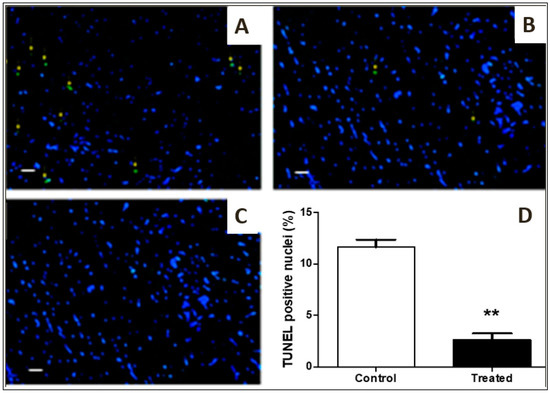 TUNEL Assay: (A,B,C): Representative images (n = 10 for each group) immunofluorescent staining for TUNEL-positive nuclei in control, treated, and negative control groups (20× magnification). TUNEL-positive myocytes were less in number in the treated group (A) as compared to control group (B). Yellow arrows indicate apoptotic nuclei and (C) negative control. p-value = 0.002 considered significant (** p < 0.001, control versus treated), scale bar is 100 µm. (D): Graphical presentation of apoptotic nuclei in control vs treated groups.