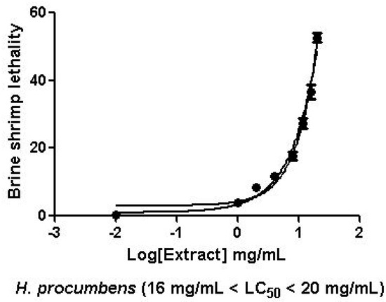 The cytotoxicity of H. procumbens extract was formerly studied with Artemia salina lethality bioassay, whose protocol is fully described in the Supplementary Materials section.
