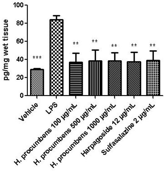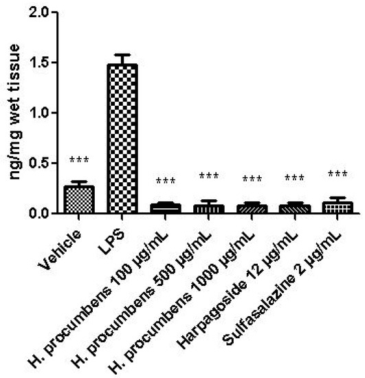 Effect of water H. procumbens extract (100–1000 µg/mL) on 8-iso-prostaglandin (PG)F2α level (pg/mg wet tissue) in mouse colon specimens challenged with LPS. ANOVA, p < 0.001; post-hoc, **p < 0.01, ***p < 0.001 vs. LPS.