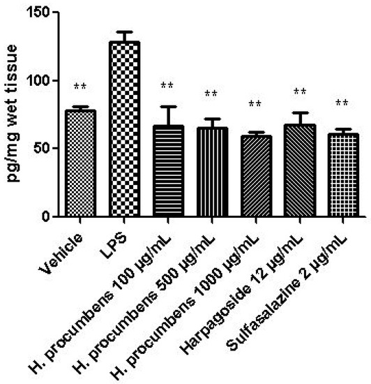 Effect of water H. procumbens extract (100–1000 µg/mL) on prostaglandin (PG)E2 level (pg/mg wet tissue) in mouse colon specimens challenged with LPS. ANOVA, p < 0.001; post-hoc, **p < 0.01 vs. LPS.