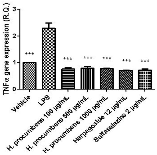 Effect of water H. procumbens extract (100–1000 µg/mL) on tumor necrosis factor (TNF)α gene expression (relative quantification) in mouse colon specimens challenged with LPS. ANOVA, p < 0.001; post-hoc, ***p < 0.001 vs. LPS.