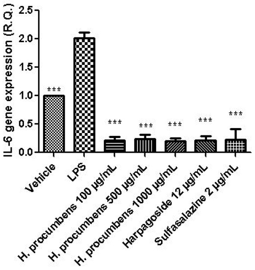 Effect of water H. procumbens extract (100–1000 µg/mL) on interleukin (IL)-6 gene expression (relative quantification) in mouse colon specimens challenged with LPS. ANOVA, p < 0.001; post-hoc, ***p < 0.001 vs. LPS.