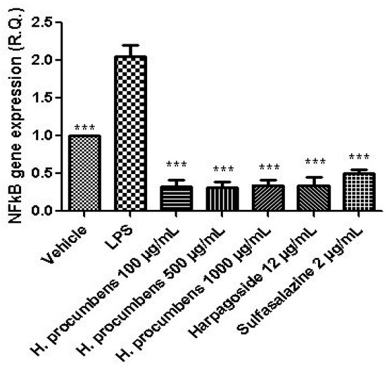 Effect of water H. procumbens extract (100–1000 µg/mL) on nuclear factor kappa B (NFκB) gene expression (relative quantification) in mouse colon specimens challenged with LPS. ANOVA, p < 0.001; post-hoc, ***p < 0.001 vs. LPS.