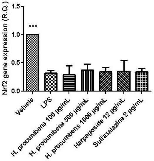 Effect of water H. procumbens extract (100–1000 µg/mL) on nuclear factor erythroid 2-related factor 2 (Nrf2) gene expression (relative quantification) in mouse colon specimens challenged with LPS. ANOVA, p < 0.001; post-hoc, ***p < 0.001 vs. LPS.