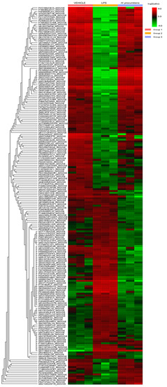 Untargeted proteomic analysis showing the effects of water H. procumbens extract (1000 µg/mL) on mouse colon specimens challenged with LPS. The activity of the detected proteins was calculated in comparison with the calibrator of the experiment (LPS group). In the figure, the green bar indicates a down-regulating effect compared to LPS, whereas the red bar indicates an up-regulating effect.