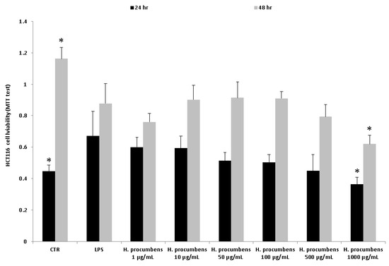 MTT assay of HCT116 human colon carcinoma cell line exposed to LPS 10 μg/mL and different concentrations (1–1000 μg/mL) of H. procumbens water extract for 24 and 48 h. ANOVA, p < 0.01; post-hoc, *p < 0.05 vs. LPS.