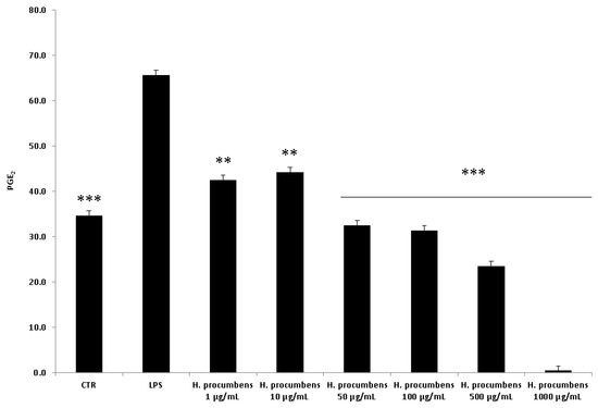 Effect of water H. procumbens extract (1–1000 µg/mL) on prostaglandin (PG)E2 level (pg/mL) in human colon HCT116 cells challenged with LPS. ANOVA, p < 0.0001; post-hoc, **p < 0.01, ***p < 0.001 vs. LPS.