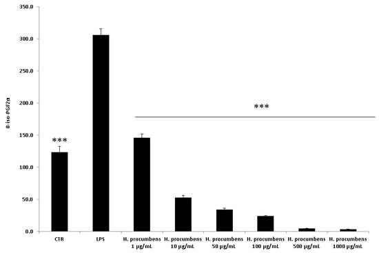 Effect of water H. procumbens extract (1–1000 µg/mL) on 8-iso-prostaglandin (PG)F2α level (pg/mL) in human colon HCT116 cells challenged with LPS. ANOVA, p < 0.0001; post-hoc, ***p < 0.001 vs. LPS.