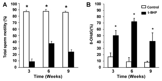 Impairment of sperm quality due to t-BHP treatment in male rats. (A) Sperm motility and (B) sperm DNA oxidation determined by 8-deoxyguanosine (8-OHdG) levels. The results are expressed as mean ± SEM. * Means higher than the other group at the same time point (p ≤ 0.05; Mann–Whitney test, n = 4).