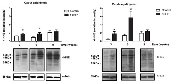 We determined oxidative damage on lipids by detecting 4-hydroxynonenal (4-HNE), a known marker of lipid peroxidation. We observed multiple bands detected by the anti-4HNE antibody, suggesting that different proteins contain the 4-HNE adduct in the tissues analyzed (Figure 2). A significant increase of 4-HNE levels was observed in both the caput and cauda epididymis of treated rats at 3 weeks and 6 weeks after the end of the t-BHP treatment compared to controls. Interestingly, the levels of 4-HNE at 9 weeks after the end of treatment were similar in the caput epididymis when comparing treated and control rats but were significantly higher than those seen in the control group at 6 weeks. In cauda epididymis, the 4-HNE levels returned to control values at 9 weeks after treatment. Noteworthily, the levels of lipid peroxidation at 9 weeks was higher in caput compared to cauda epididymis, suggesting an early dysregulation of the antioxidant response in the caput epididymis.