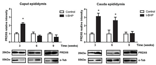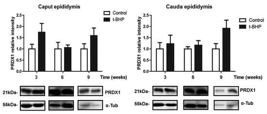 We previously reported that spermatozoa from rats challenged with an in vivo oxidative stress using tert-butyl hydroperoxide (t-BHP), and collected 24 h after the treatment, have higher levels of DNA oxidation and lipid peroxidation and displayed poor motility compared to untreated controls [18]. There was a differential expression of PRDX1 and PRDX6 in a different segment of the epididymis of the treated rats. Interestingly, these spermatozoa contain high levels of PRDXs, as an attempt of the epididymis to fight against the oxidative stress established by the treatment [18].