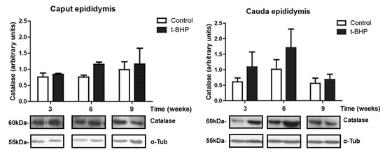 Catalase expression levels were determined in rat epididymis from control and treated rats. Although not significant, we observed a trend of increase in treated rats compared to control at 3 and 6 weeks in cauda epididymis (Figure 5). Caput epididymis did not show upregulation of catalase at any time point.