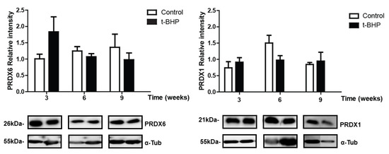 No significant difference was observed between the control and treated groups at any time points for PRDX1, PRDX6, catalase or TRX-1 (Figure 6 and Figure 7).