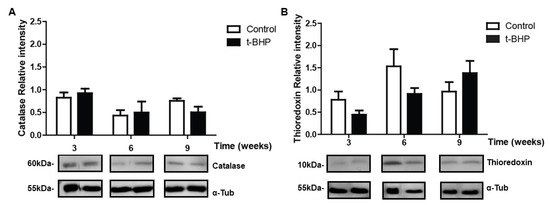 3.5. PRDXs, Catalase and Thioredoxin Expression Levels and Lipid Peroxidation Are Similar in Testis Despite the t-BHP Treatment