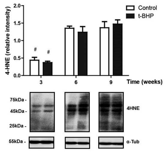 The levels of 4-HNE in testis were similar in control and treated rats, suggesting that the oxidative stress generated by the treatment was well tolerated by the testis (Figure 8). Noteworthy, the levels of 4-HNE increased in testis from both control and treated rats at 6 and 9 weeks, suggesting that there is time dependency in the levels of lipid peroxidation in this organ.