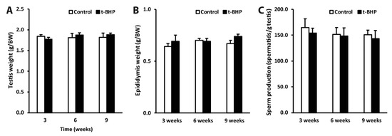 To determine whether the damages observed in epididymal spermatozoa may have originated due to impairment of spermatogenesis by t-BHP treatment, we analyzed testis sections from control and treated groups to identify the different stages of spermatogenesis, compared the reproductive organs weight and sperm production in the experimental groups. We did not observe differences in body and organ weights between the treated and control rats at any time point (Figure 9 and Supplementary Materials Table S1).