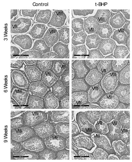 Histological analysis of testes from control and t-BHP-treated male rats. Testis sections were stained with hematoxylin and eosin to evaluate spermatogenesis. All testis sections displayed normal spermatogenesis (Stages VII and VIII showing elongating spermatids and spermatozoa in the lumen of the seminiferous tubules, respectively), n = 4. Bar = 300 μm.