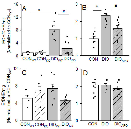 Reactive oxygen species-products hydroxyethidium (EOH) and ethidium (E) per dihydroethidium (DHE) consumed in cardiac tissue from lean controls (CONWT and CONKO) and obese (DIOWT and DIOKO) wild type and NOX2 KO mice fed a high fat diet for 28 weeks (A,C). Also shown in lean (CON), obese (DIO), and apocynin-treated obese (DIOAPO) C57BL/6J mice fed a western diet for 28 weeks (B,D) n = 4–8 in each group. Values are normalized to EOH in lean controls. Single values and means ± SEM. * p < 0.05 CON vs. DIO within same genotype, # p < 0.05 DIOWT vs. DIOKO and DIO vs. DIOAPO.