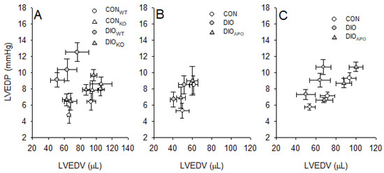 Steady state left ventricular end-diastolic volumes (LVEDV) and pressures (LVEDP) at three different workloads (preload: 4,6 and 8 mmHg and afterload: 50mmHg) from lean controls (CONWT and CONKO) and obese (DIOWT and DIOKO) wild type and NOX2 KO mice fed a high fat diet for 28 weeks (A), as well as lean (CON), obese (DIO) and apocynin-treated obese (DIOAPO) C57BL/6J mice fed a western diet for 18 (B) and 28 weeks (C). n = 5–10 per group, the values are mean ± SEM.