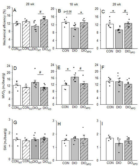 Left ventricular mechanical efficiency (A–C) expressed as stroke-work (SW, G–I) relative to myocardial oxygen consumption (D–F) in hearts from lean controls (CONWT and CONKO) and diet-induced obese (DIO) wild type and NOX2 KO mice (DIOWT and DIOKO) fed a high fat diet for 28 weeks (A,D,G) as well as lean controls (CON) and untreated and apocynin-treated obese C57BL/6J mice (DIO and DIOAPO) fed a western diet for 18 weeks (B,E,H) or 28 weeks (C,F,I). Single values and means ± SEM. * p < 0.05 CON vs. DIO within same genotype, # p < 0.05 DIOWT vs. DIOKO and DIO vs. DIOAPO.