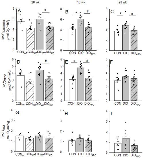 Myocardial oxygen consumption in mechanically unloaded hearts (MVO2unloaded, A–C) and for processes associated with excitation-contraction coupling (MVO2ECC, D–F) and basal metabolism (MVO2BM, G–I) that was obtained from lean controls wild-type (CONWT) and NOX2-KO mice (CONKO) and obese mice fed a high fat diet for 28 weeks (DIOWT and DIOKO). (A,D,G). Also shown in lean controls (CON) and untreated and apocynin-treated obese C57BL/6J mice (DIO and DIOAPO) that were fed a western diet for 18 weeks (B,E,H) or 28 weeks (C,F,I). Single values and means ± SEM. * p < 0.05 within the same genotype, # p < 0.05 between genotypes within the same diet.