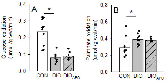 Glucose (A) and palmitate (B) oxidation rates measured in isolated working hearts from lean controls (CON), diet-induced obese (DIO), and obese apocynin-treated (DIOAPO) C57BL/6J mice fed an obesogenic western diet for 18 weeks. Single values and mean ± SEM, * p < 0.05 vs. DIO.