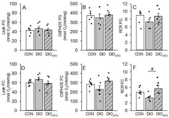 We further studied the mitochondrial function in ventricular tissue from CON, DIO, and DIOAPO mice that were fed a WD for 28 weeks. The respiration rates were measured while using pyruvate and glutamate (PG) or palmityol-carnitine (PC) as substrates. There were no significant changes in Leak or OXPHOS states when using PG or PC as substrates in isolated cardiac mitochondria (Figure 6A,B,D–E). Respiratory control ratios (OXPHOS/Leak) were not significantly different between groups when using PG as substrates (Figure 6C), but significantly higher in the mitochondria from DIOAPO hearts when using PC as substrates. There was also with a borderline difference between CON and DIO (p = 0.08, Figure 6F).