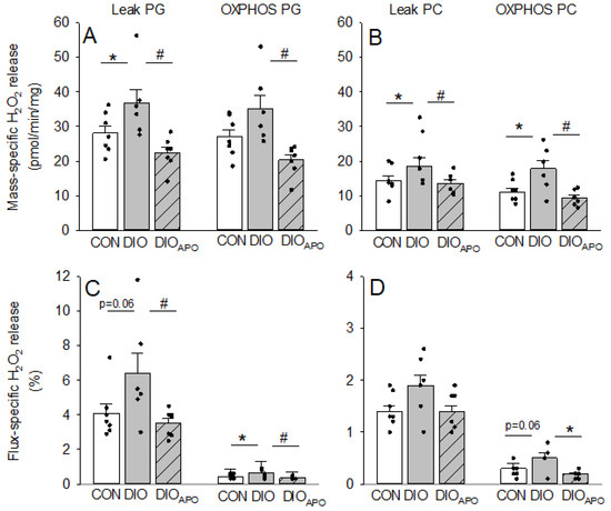 Mass-specific and flux-specific H2O2- release from isolated cardiac mitochondria using either pyruvate and glutamate (PG, panel A and C) or palmityol-carnitine as substrates (PC, panel B and D) as substrates. Mitochondria were obtained from lean controls (CON) and untreated and apocynin-treated obese C57BL/6J mice (DIO and DIOAPO) fed a western diet for 28 weeks. Single values and means ± SEM, * p < 0.05 CON versus DIO, # p < 0.05 DIO vs. DIOAPO.