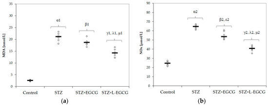 Distribution of oxidative stress intensity by groups: (a) MDA (malondialdehyde), (b) NOx (indirect nitric oxide), (c) TOS (total oxidative status) on all study groups (7 rats/group). STZ = streptozotocin control; STZ + EGCG = STZ and EGCG solution i.p. as pretreatment; STZ + L-EGCG = STZ and liposomal EGCG i.p. as pretreatment. The symbol–number codes correspond to the p-values < 0.05 as follows: α—STZ compared to control; β—STZ + EGCG compared to control; ε—STZ + EGCG compared to STZ; γ—STZ + L-EGCG compared to control; λ—STZ + L-EGCG compared to STZ; µ—STZ + L-EGCG compared to STZ + EGCG.
