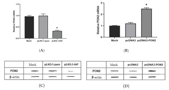 PON2 expression was also detected at the protein level by Western blot analysis. The results obtained showed that, compared with controls, cells transfected with pLKO.1–647 or pcDNA3-PON2 plasmid vectors displayed markedly decreased or increased PON2 levels, respectively (Figure 1C,D).