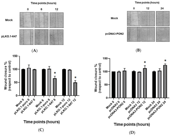 Migration ability of T24 cells. Wound healing assays were used to assess the impact of PON2 expression on cell migration. T24 cells transfected with the plasmid aimed to induce enzyme knockdown (panel A) or overexpression (panel B) were photographed immediately (0 h) after wounding by a pipette tip and at different time points, ranging between 6 and 24 h. The migration ability of T24 cells down- (panel C) or upregulating PON2 (panel D) was evaluated by measuring their efficiency in wound repair compared with that of mock samples. All values are expressed as the mean ± standard deviation (*p < 0.05).