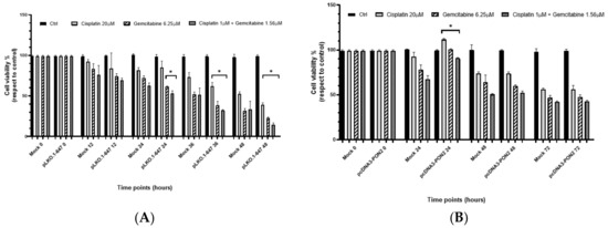 As demonstrated in Figure 4A, treatment with cisplatin alone led to a significant (p < 0.05) decrease in the proliferative capacity of cells transfected with pLKO.1-647 compared with that of the mock, after 36h (15% reduction) and 48h (25% reduction). Treatment with gemcitabine alone or with both drugs was significantly (p < 0.05) associated with a reduction in the viability of PON2 downregulated cells (pLKO.1-647) with respect to that of the mock at 24 h (14% reduction for gemcitabine and 16% reduction for both drugs), 36 h (27% reduction for gemcitabine and 37% reduction for both drugs), and 48 h (28% reduction for gemcitabine and 59% reduction for both drugs) time points (Figure 4A).