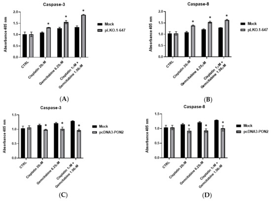 On the other hand, T24 cells overexpressing PON2 showed significantly (p < 0.05) lower levels of caspase-3 and caspase-8 activity than those determined in the mock. Concerning caspase-3, the reduction of activity levels was enhanced in PON2 overexpressing cells that underwent combined treatment (1.35-fold reduction) compared with that observed after incubation with cisplatin (1.18-fold reduction) or gemcitabine (1.19-fold reduction) alone. Conversely, the decrease of caspase-8 activity detected in T24 cells upon enzyme overexpression (pcDNA3-PON2) did not seem to be significantly altered based on treatment with different compounds or the drug combination (1.25-fold reduction for cisplatin, 1.30-fold decrease for gemcitabine, and 1.28-fold decrease for both drugs) (Figure 6C,D).