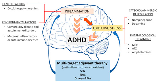 Role of inflammation and oxidative stress in the pathophysiology of ADHD and potential adjuvant therapy. Environmental and genetic factors, catecholaminergic dysregulation and pharmacological treatment can establish a vicious circle, producing inflammation and oxidative stress, therefore contributing to increase the symptoms. SFN, sulforaphane; NAC, N-Acetylcysteine; omega-3 FAs, omega-3 fatty acids; MPH, methylphenidate; ATX, atomoxetine.