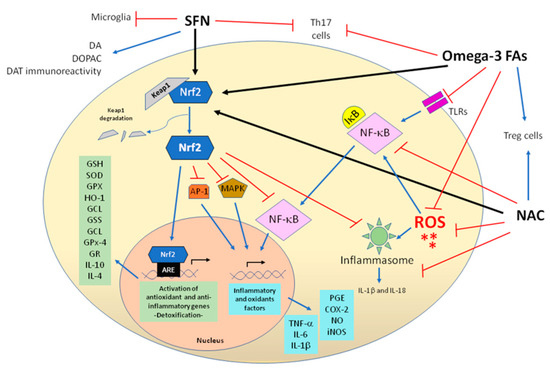 Overview of the mechanisms of SFN, NAC and Omega-3 FAs used as modulators against inflammation and oxidative stress. DA, dopamine; DOPAC, 3,4-dihydroxyphenylacetic acid; DAT, dopamine transporter; PGE, prostaglandins; ROS, reactive oxygen species; NO, nitric oxide; GCL, glutamate cystine ligase; GPx, glutathione peroxidase; GSH, glutathione; SOD, superoxide dismutase; GR, glutatione reductase; GSS, glutathione synthetase; glutathione peroxidase-4, GPx-4.