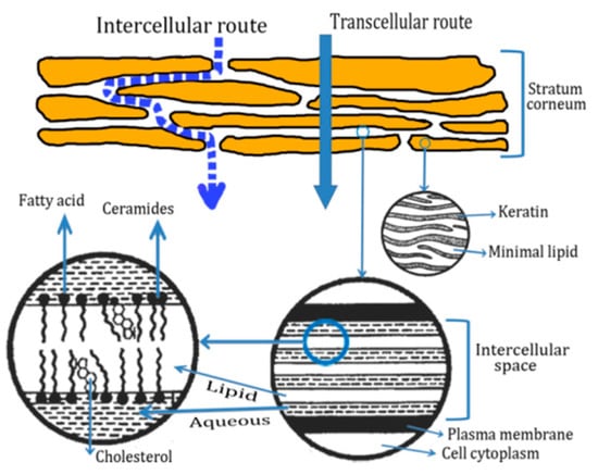 The SC of the skin represents the main barrier to the penetration of cosmetic products. The penetration of active ingredients in the skin can be carried out by two routes as illustrated in Figure 2. The intercellular path is the most common route for penetration of drugs and cosmetic products in the skin. SC is composed of multiple lipid bilayers of ceramides, fatty acids, and cholesterol. The corneocytes are embedded in a multi-lamellar lipid matrix in a fashion often described as "brick and mortar structure [31]. For the transcellular route, different pathways of circumventing the SC have been developed by the selection of proper drugs, the addition of liposomes, previous hydration of the SC, and chemical penetration enhancers. Other aggressive ways where SC is bypassed include: microneedle array, stratum corneum ablated, follicular delivery, electrically assisted methods (ultrasound, iontophoresis, electroporation, etc.) [29,30].