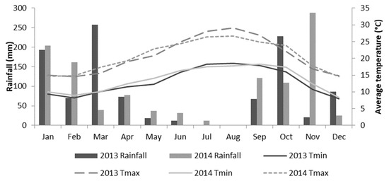 Climatic conditions (Tmin, Tmax, and rainfall) in 2013 and 2014 in Sintra, Portugal.
