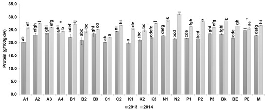 Protein content of 10 common bean cultivars from 2013 and 2014, grouped according to their morphological characteristics. Cultivars: Arikara yellow (A1, A2, A3, A4), butter bean (B1, B2, B3), cranberry (C1, C2), red kidney (K1, K2, K3), navy (N1, N2), pinto (P1, P2, P3), black (Bk), brown eyed (BE), pink eyed (PE), and tarrestre (M). The absence of common letters (a–l) indicates significant differences at p < 0.05; Tukey’s multiple range tests were performed for each year separately. * indicates that it does not differ significantly at p < 0.05 between the two harvesting years.