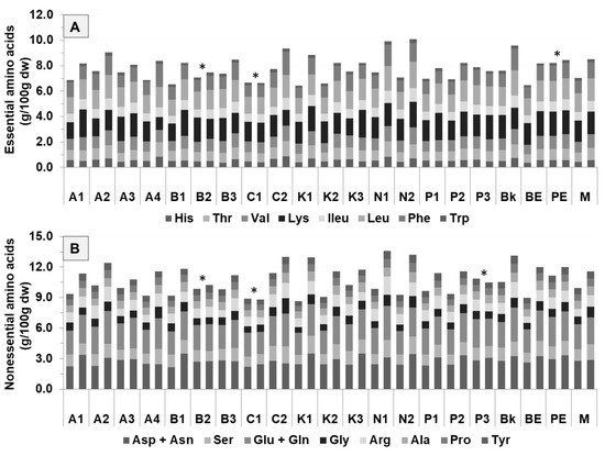The content of essential and nonessential amino acids was higher (p < 0.05) in 2014 (0.1−1.6 g/100 g dw and 0.3–2.7 g/100 g dw, respectively) than in 2013 (0.1–1.2 g/100 g dw and 0.2–2.2 g/100 g dw, respectively), as expected due to their protein contents (Figure 3).