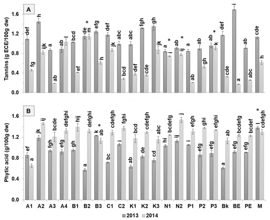 Antinutritional composition of 10 common bean cultivars, grouped according to their morphological characteristics: (A) tannins and (B) phytic acid content from 2013 and 2014. Cultivars: Arikara yellow (A1, A2, A3, A4), butter bean (B1, B2, B3), cranberry (C1, C2), red kidney (K1, K2, K3), navy (N1, N2), pinto (P1, P2, P3), black (Bk), brown eyed (BE), pink eyed (PE), and tarrestre (M). The absence of common letters (a–l) indicates significant differences at p < 0.05; Tukey’s multiple range tests were performed for each year separately. * indicates that it does not differ significantly at p < 0.05, between two harvesting years.