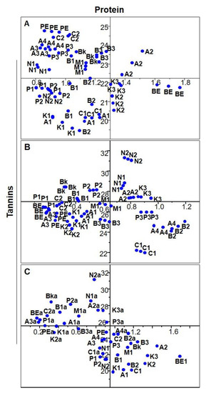 Plot of tannins vs. protein content of 10 common bean cultivars, grouped according to their morphological characteristics. Cultivars: Arikara yellow (A1, A2, A3, A4), butter bean (B1, B2, B3), cranberry (C1, C2), red kidney (K1, K2, K3), navy (N1, N2), pinto (P1, P2, P3), black (Bk), brown eyed (BE), pink eyed (PE), and tarrestre (M). (A) Triplicates of each sample from 2013, (B) triplicates of each sample from 2014, (C) average of each sample in both years, the samples being divided according to their harvest years.