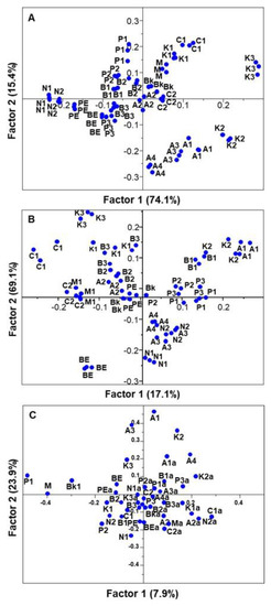 Partial least squares regressions were performed using the triplicates of each sample, for the years 2013 and 2014, and for both years together; the results are presented through a plot of the scores obtained for the first two factors, regarding all samples. These explain 89.5% and 86.2% of the total variability in 2013 and 2014, respectively (Figure 6A,B). For both years, and using the average of each sample, these two factors explain only 30.8% of total variability (Figure 6C).