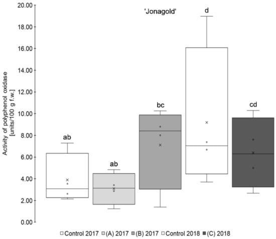 49], the TPC values of ‘Golden Delicious’ were in a comparable range, whereas the TPC of ‘Jonagold’ apples was somehow much lower in the present study.
