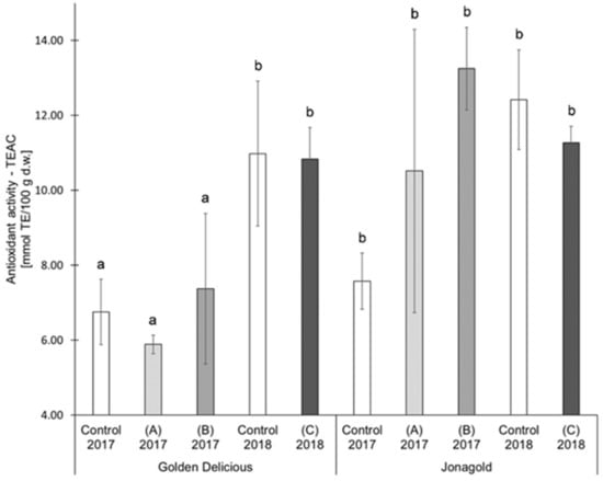 An influence of the weather can also be deduced when comparing the controls from the years 2017 and 2018, similarly to the TPC values. AOA measured as TEAC of the untreated ‘Golden Delicious’ apples from the season 2017 was 6.76 mmol TE/100 g d.w. In the following year, an increase of 62.4% was observed with a value of 10.98 mmol TE/100 g d.w. For ‘Jonagold’, AOA of 7.58 mmol TE/100 g d.w., and 12.42 mmol TE/100 g d.w. were measured, corresponding to an increase of 63.9%. With regard to ORAC values, an increase of the AOA could also be observed for ‘Golden Delicious’, being 73.6% (5.53 mmol TE/100 g d.w. in 2017 and 9.60 mmol TE/100 g d.w. in 2018). For ‘Jonagold’, on the other hand, only a moderate increase of 17.6% was observed (9.56 mmol TE/100 g d.w. in 2017 and 11.24 mmol TE/100 g d.w. in 2018).
