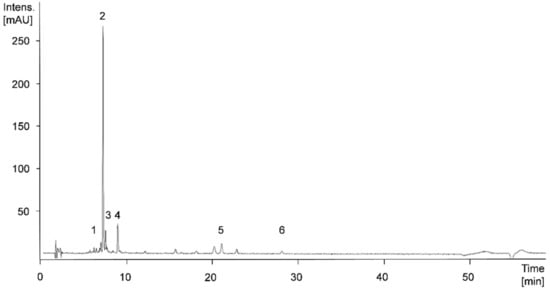 Figure 6 shows an exemplary HPLC-chromatogram at 280 nm of an apple sample of the cultivar ‘Jonagold’, biofortified with 0.075 kg Se/ha in the form of selenate, produced in the year 2018. In